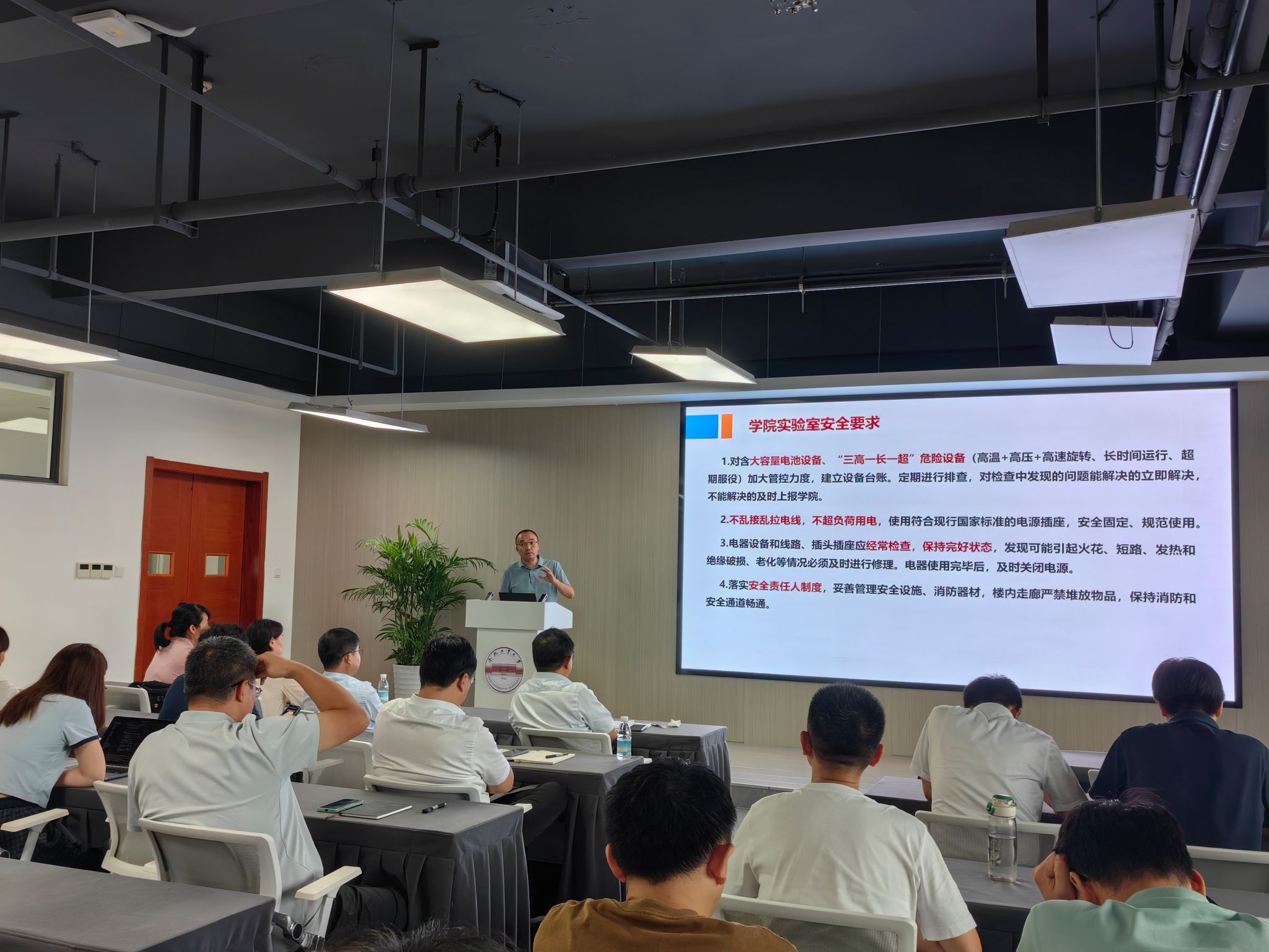 王辉副经理就实验室安全管理工作进行提醒,要求加强对大容量电池设备及高危设备的台账管理,规范用电行为,定期排查电气安全隐患,并严格落实安全责任人制度。