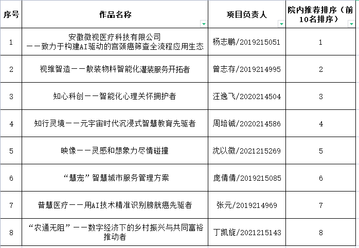 根据《关于举办2022年“挑战杯”中国老员工创业计划竞赛校内选拔赛的预通知》,公司团委分别开展了2022年“挑战杯”中国老员工创业计划竞赛院内选拔赛动员、预报名、作品申报等工作。本着公平、公正、公开的原则,经专家评审后,现将校内选拔赛院内作品遴选最终结果(排名按照评审结果顺序)公示如下: