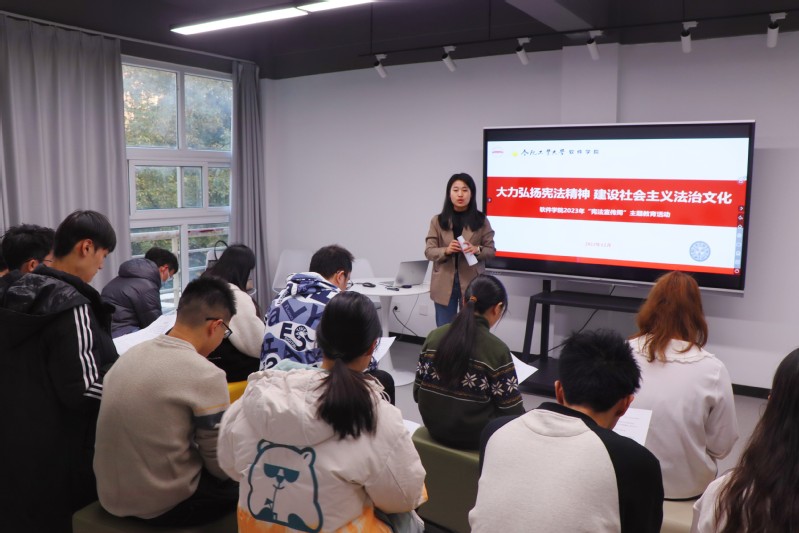 活动中,洪晓梅向同学们介绍了宪法诞生和发展历史,并结合宪法条文和具体案例说明宪法与我们每个人的生活、教育、工作息息相关,号召大家在日常生活中能够积极弘扬宪法精神,维护宪法权威。随后,她列举了校园贷、人脸识别的安全隐患、电信诈骗、个人隐私泄露等生活中随处可见的侵权事件进行剖析,引导同学们增强遵纪守法的意识和运用法律维护自身合法权益的能力。活动最后,同学们诵读了《中华人民共和国宪法》序言。