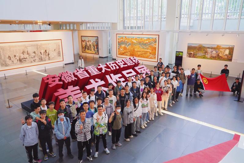 走进安徽省美术馆,同学们仿若置身艺术殿堂。这里有青年美术家的作品荟萃、国内外艺术大师作品,有彰显安徽地域特色的“新徽派版画”,更有展现安徽历史变迁和时代发展特征的“安徽省重大历史题材美术作品展”。同学们认真欣赏艺术画作,在赏美的过程中提高了审美力。软件工程22-2班团支书董泓琳说:“不同历史时期的重大事件、重要场景和杰出人物以国画、油画、版画、雕刻等多种形式呈现,让我们对安徽省近现代发生的重大历史事件和涌现出的杰出历史人物有了更深入的了解,民族自豪感和爱国热情一下子就被激发了。”