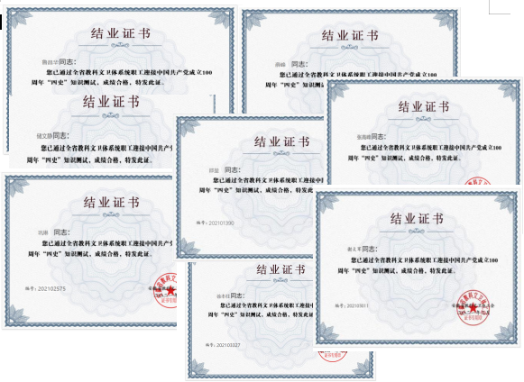 全院教职工通过对“党史、新中国史、改革开放史、社会主义发展史”等学习、测试、全部成绩合格获得结业证书,达到“四史”学习、测试、结业,全覆盖。