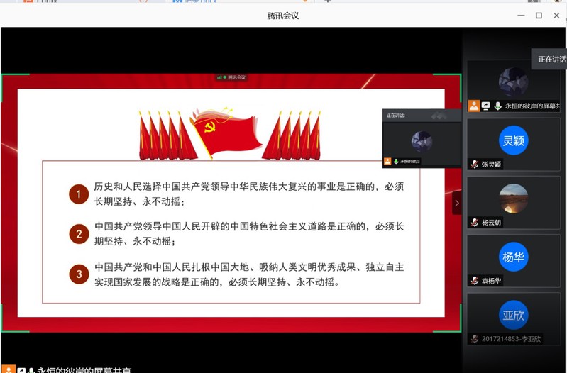 支部组织委员唐涵首先从党史的发展脉络、党的历史给我们的启示、党的历史贡献三个方面与大家一起重温了中国共产党的发展历程,并带领大家一起观看了教学视频《风华正茂》。随后,党支部每位党员结合疫情期间自身的经历,讲述了身边的感人战疫故事,分享成长感悟。有的同学讲述了母亲作为一名共产党员和社区工作者连续两个月无休奋战在抗疫第一线的故事;有的同学分享了身边亲人奔赴武汉抗击疫情的故事;有的同学分享了家乡派出所一位民警在疫情中奋斗直至献出生命的故事……一个个鲜活的事例,让每一个坐在屏幕前的党员员工深受鼓舞,他们切身感受到危难时刻党员挺身而出的力量,体会到一个党员就是一面旗帜的真正内涵,充分认识到正是党的正确领导,无数党员的辛苦付出,全国民众的团结一致才取得抗击疫情的阶段性胜利。