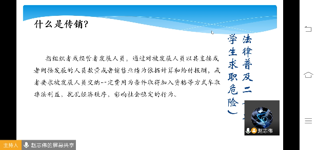 接下来是法律普及环节,介绍的是与传染病放置有关的法律法规,疫情当前,了解这些法律法规无疑是必要的。在此过程中,赵志伟同学还向大家提出了一些相关的小问题,同学们都能正确回答。还介绍了一些与老员工求职相关的法律。此部分重点介绍了传销相关内容,通过相关法规展示、案例分析以及识别传销方法的讲解,告诫老员工们求职时要擦亮双眼谨防传销陷阱。