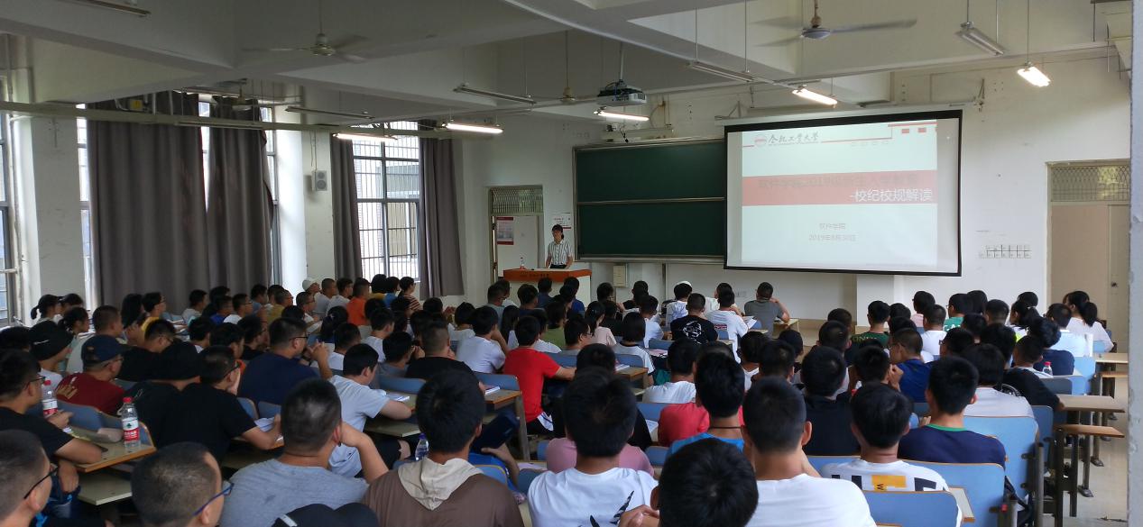 8月30日下午,m88团委书记袁杨华老师和辅导员朱子琪老师在翡翠湖校区三教201教室给全体2019级新生作校规校纪教育,介绍了校规校纪、考试中的一些注意事项、违纪的处罚等,对公司系列资助政策进行了讲解,为同学们在学习生活中的常见问题进行了详尽解答。