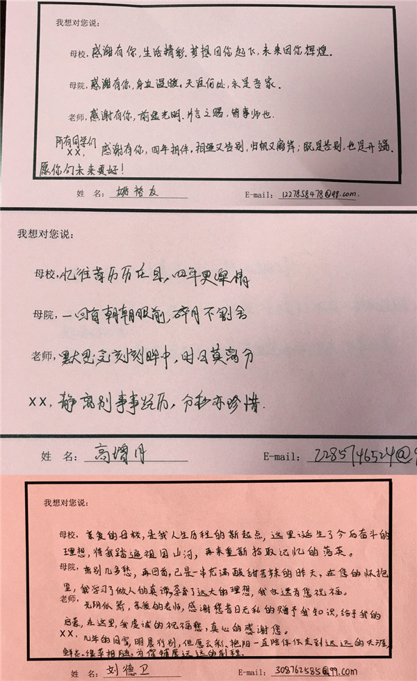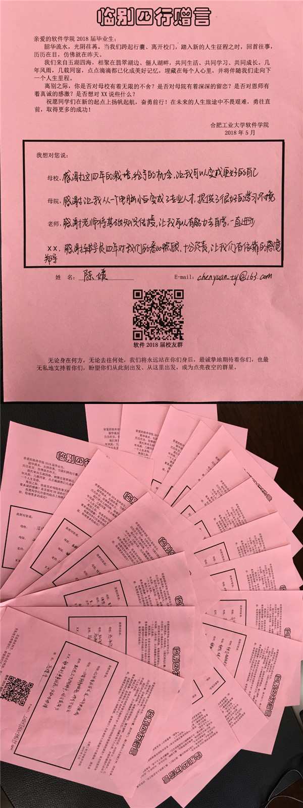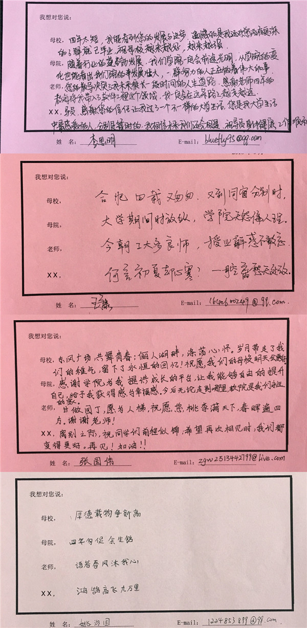活动一经发起,共收集2018届全体毕业生82份满满的祝福:“‘厚德、笃学、崇实、尚新’铭记于心,为母校添彩”;“厚德载物争新高,四年匆促余生铭,语若春风暮我心,鸿鹄高飞九万里”;“ 合肥四载又匆匆,又到同窗分别时。大学期间时放纵,公司无怨诲人理。今朝工大多良师,授业解惑不敢忘。何言初夏却心寒,一腔离愁无处放。”;“ 母校,忆往昔历历在目,四年更深情;母院,一回首朝朝眼前,碎月不割舍;老师,默思念刻刻眸中,时日莫离分;同学,静离别事事经历,分秒亦珍惜。”“母校,感谢有您,生活精彩,梦想因您起飞,未来因您辉煌。母院,感谢有您,身边温暖,天涯何处,永是吾家。老师,感谢有您,前途光明,片言之赐,皆事师也。所有同学,感谢有你们,四年相伴。相逢又告别,归帆又离岸;既是告别,也是开端。愿你们未来更好!”……