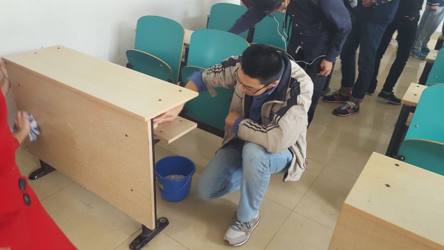 同学们被分成若干组,准时来到教学楼进行打扫。同学们细心的将教室里面的乱张乱贴,粘在墙上的胶带、桌椅上的乱涂乱画等一一清除,并将黑板和讲台的整理擦拭,为构建一个整洁、美丽、和谐的校园贡献着自己的力量。