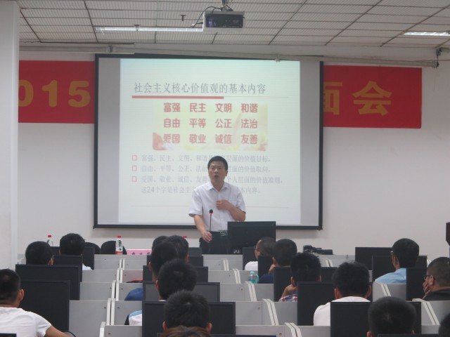 张书记首先与2015级新生进行了初步的交流,之后简单提问了一些关于我国国家安全及社会主义精神文明建设的问题,深入浅出的提出了社会主义核心价值观的概念。张书记指出,作为一名老员工,尤其是重点高校的老员工,更应该严格要求自己,关心国家大事,关心社会主义建设,在做好自己身为员工的本职工作的同时还要关注思想道德建设,弘扬社会正能量,为社会主义核心价值观的全面践行付出自己的努力。最后,他要求大家要认识到自身的不足,在生活中积极调整,做出正确的自我定位,规划好老员工涯,树立明确的人生目标,在大学圆梦!