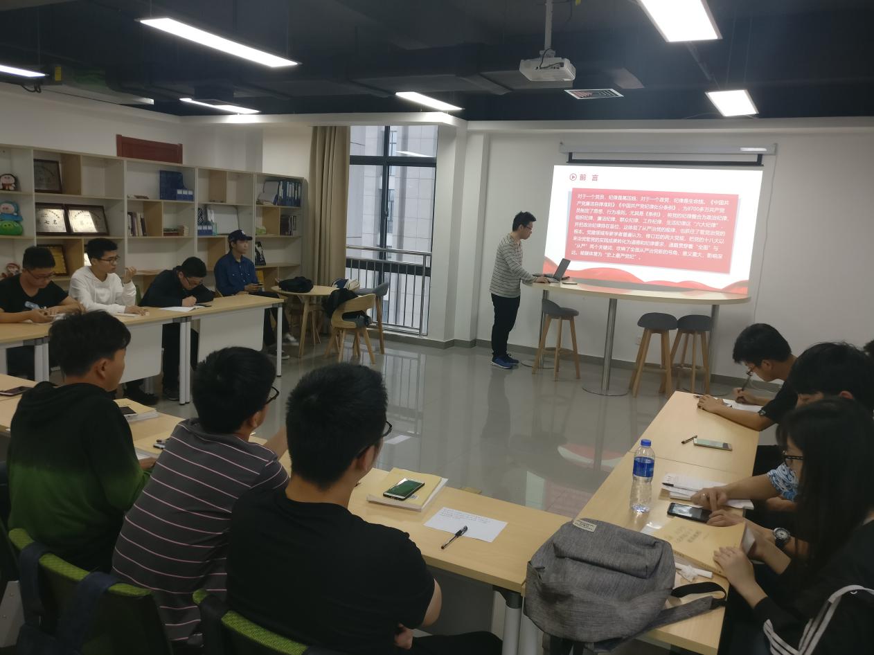 首先,由第五组成员主持党课的集中学习,通过PPT的方式系统地讲解了党在纪律方面相关规定,PPT中讲到“所有为保证全党行动一致,巩固党的纪律、维护党和人民的利益所作的各项规定,都是党的纪律”,同学们对此概念进行积极思考,针对“哪些行为属于维护单和人民的利益的行为?”等问题积极发言讨论,同学们表示“每个党员必须自觉地用党的纪律约束自己,并接受党组织和人民群众的监督,只有这样才是一名合格的党员”。在讨论的过程中,大家的积极发言,针对当前自己对党的纪律认识,结合老员工的学习生活实际,表达了自己对于党的纪律建设的理解以及如何党的纪律建设的观点。