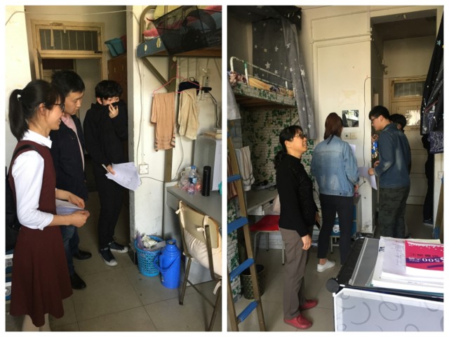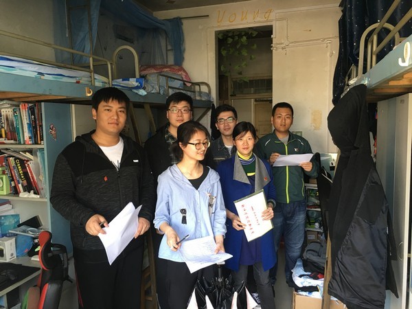 在公司党委副书记张炳武老师的带领下,检查人员来到员工6号宿舍。张书记首先对参与本次安全卫生检查的师生党员进行了小组分工,共设3个检查小组,每组由1-2名教工党员带队,物业人员和员工党员4-5名组成。他希望检查人员可以深入寝室,了解员工在寝室的生活状态,能够及时发现员工寝室存在的不卫生、不文明、不安全的问题和隐患,并详细记录提出相应整改要求。
