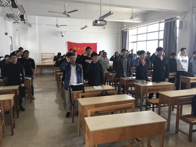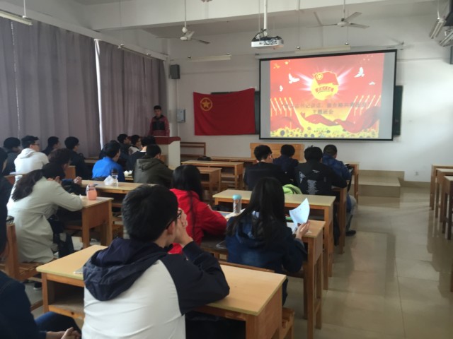 活动伊始,全班同学用高亮的嗓音奏唱团歌《光荣啊,中国共青团》。紧接着由团支部书记叶飞同学就习近平总书记发表的重要讲话中的对广大青年提出的坚定理想信念、练就过硬本领、勇于创新创造、矢志艰苦奋斗、锤炼高尚品格五个方面的重要要求带领全班同学进行深刻理解、学习,同时全班同学依次就自身是否完成这五个重要要求进行自我批评、提出改进措施。之后,叶飞同学又介绍五四表彰相关事宜,并通过“自荐-发言-投票“方式选出一名优秀团员,由宣传委员刘延祺进行统票工作。最后,由辅导员袁杨华老师作致辞以及全体同学重温入团誓词。
