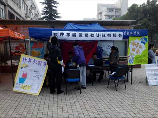 通过与学长交流我了解到,我们“微爱社”在这虽然看起来有点朴素的活动中也是下足了工夫的。特别的考虑了种种细节,比如为了给学弟学妹们锻炼的机会,这次活动由13级大一的员工全权负责。学长们只在旁边提供一些必要的帮助。而且在活动的同时,我们“微爱社”也贯彻节约环保的精神,比如不发传单不贴小广告,甚至连宣传海报也设计成可重复利用的模样。中午十二点左右,人渐渐多了起来,虽然我们的志愿者为了给同学解决电脑的问题连饭都没顾上吃。不过看到同学们在问题得到解决后露出的满意神色。我们由衷的为我们是“微爱社的一员”感到自豪。